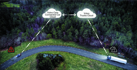 A cloud-based service, Connected Safety, will allow Volvo trucks and Volvo cars to automatically alert each other to hazardous traffic situations. The two independent vehicle manufacturers are allowing their respective vehicles to share real-time traffic hazard information via their clouds.