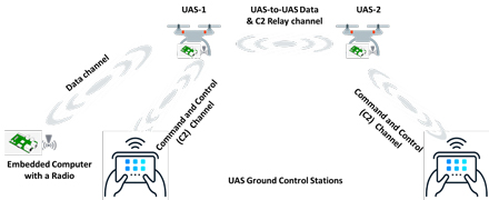 UAS-to-UAS communications—i.e., UAS-1 and UAS-2 sharing telemetry and/or application-specific information between them and with the GCS—should be an integral component of the project.
